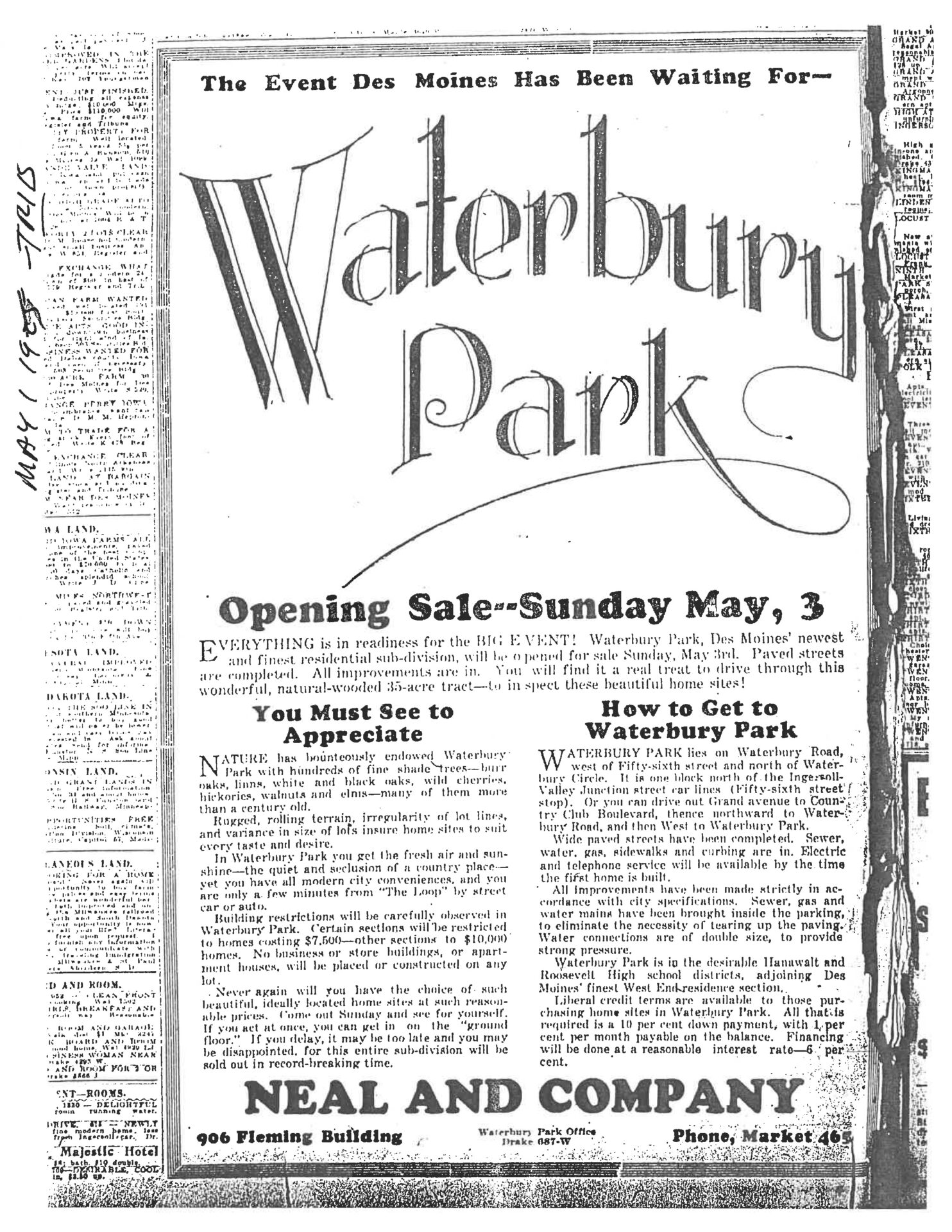 Top: A 1923 newspaper ad for Neal and Company’s Waterbury Park opening sale. Bottom: Rendering shows the planned entrance and overhead view of Waterbury Park, a luxury community of 21 homes being built by Neal Signature Homes in Lakewood Ranch. Additional photos and renderings available on request.